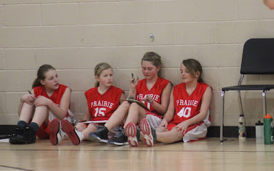 The "littles" on the team (4 sixth graders) didn't get a whole lot of playing time, but they were the stats keepers and cheering squad! They played the last minute or two of a couple games that their team was way ahead or behind in. At most games they weren't relegated to the floor, but this particular gym didn't have enough seats. (Ellea is number 40.)